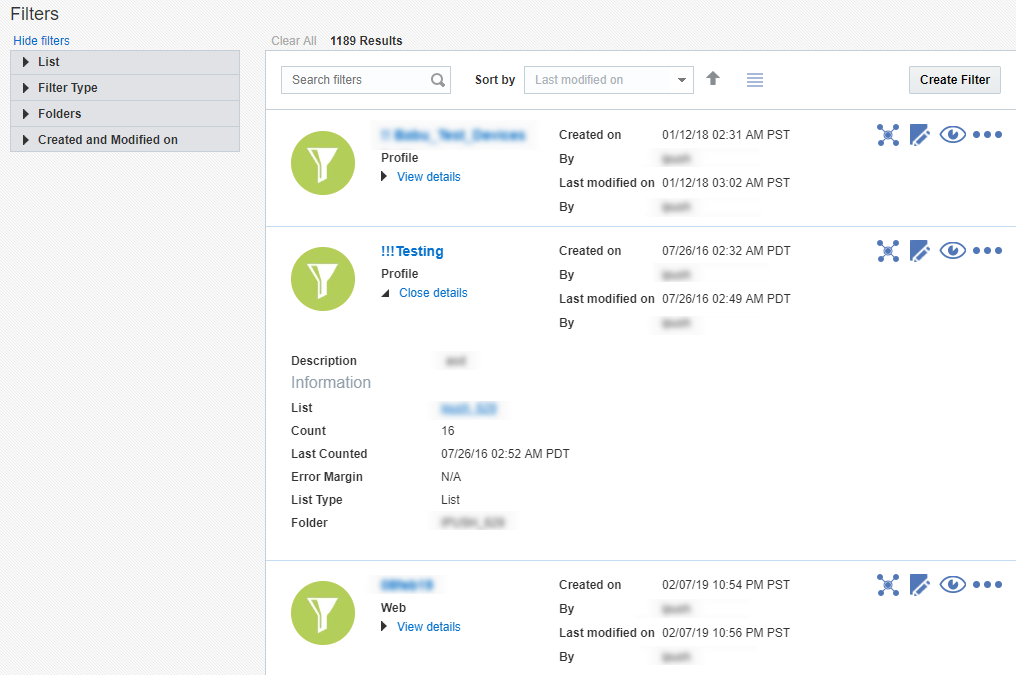 This change improves marketers' ability to easily access and manage filters. The user-centric design focuses on key usability aspects such as search, filter, sort, and load additional filters upon scroll. In addition, the page supports two views: a detail view and a tabular list.