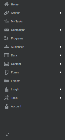 The menu items in the Responsys navigation menu (also known as the "hamburger menu") have been reorganized so that all Create options now exist under the Actions menu item. Additionally, users can access the new filter management page via the Audience menu item. The filter management page will enable users to manage and search for filters that exist in the account.