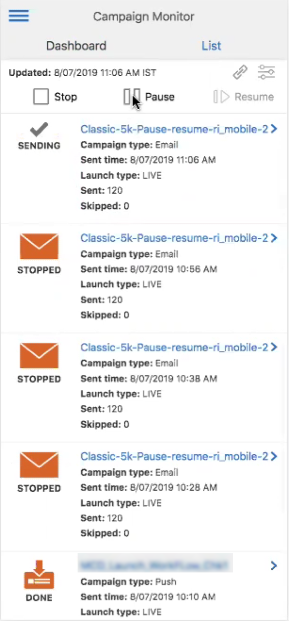 Campaign Directors and Account Administrators can now pause, resume, and stop campaign launches from the Campaign Monitor via the Mobile Web App. This feature was previously only available on the desktop version.