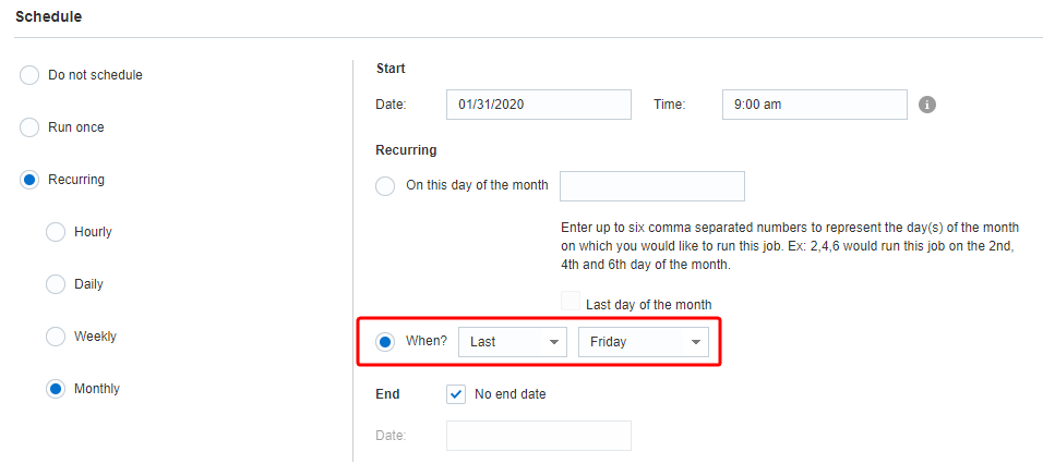 When scheduling a Connect job, you are now able to select the last day of the week in monthly scheduling.