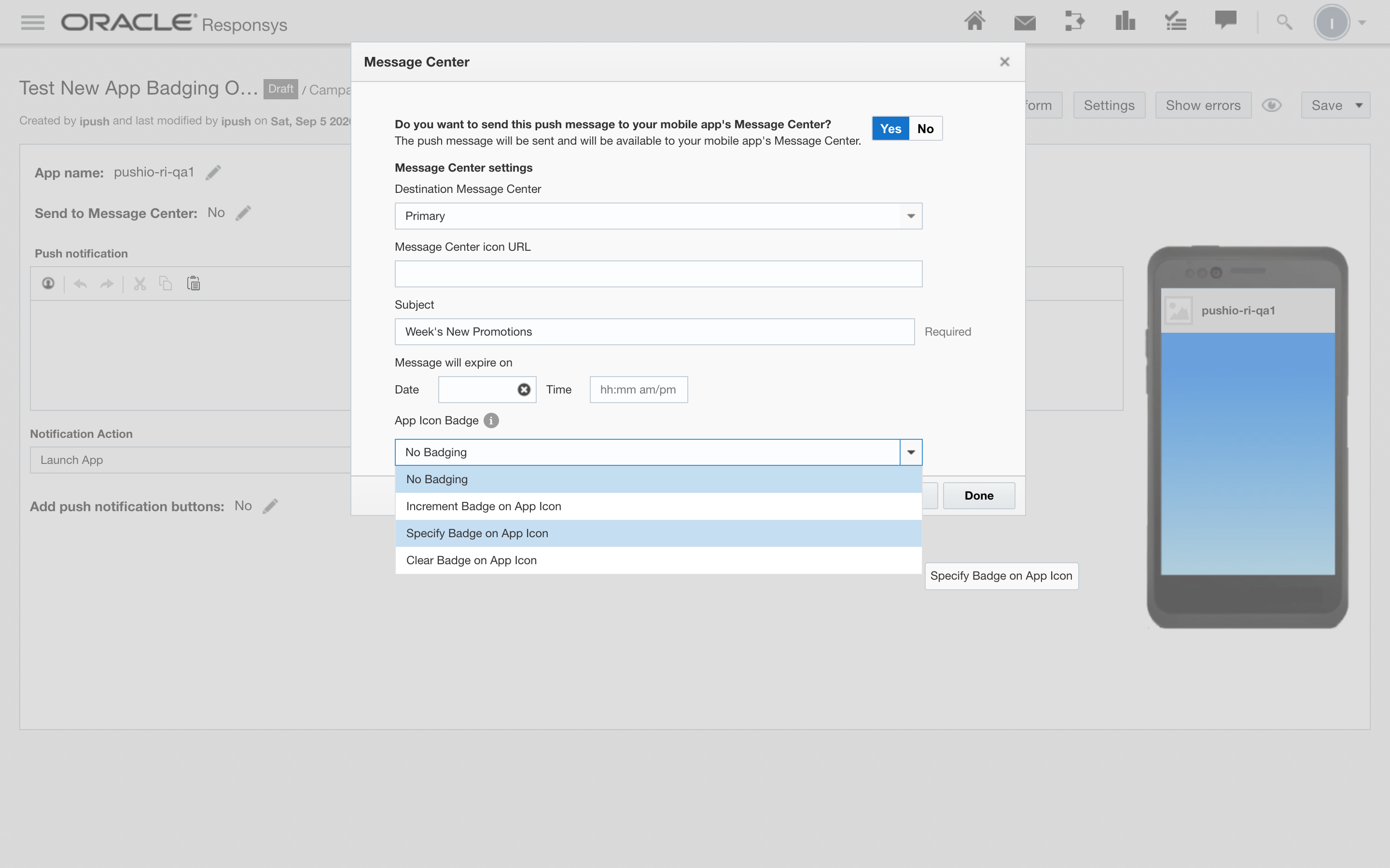 Since the 19B update, Responsys has supported app icon badging on end user devices through both Push + Message Center and Message Center campaigns, allowing you to choose to increment the badge count for every message center message sent to an end user's device.