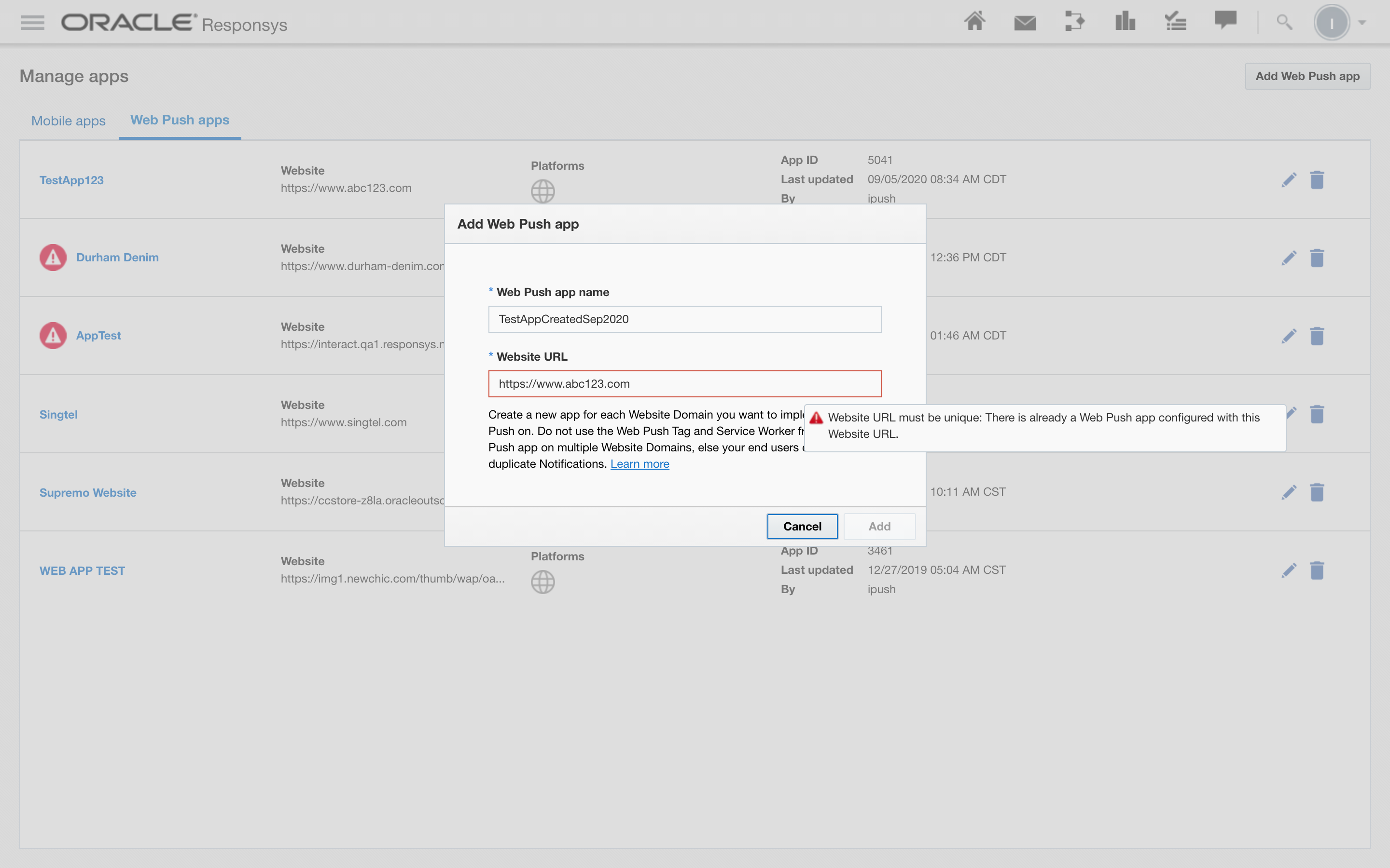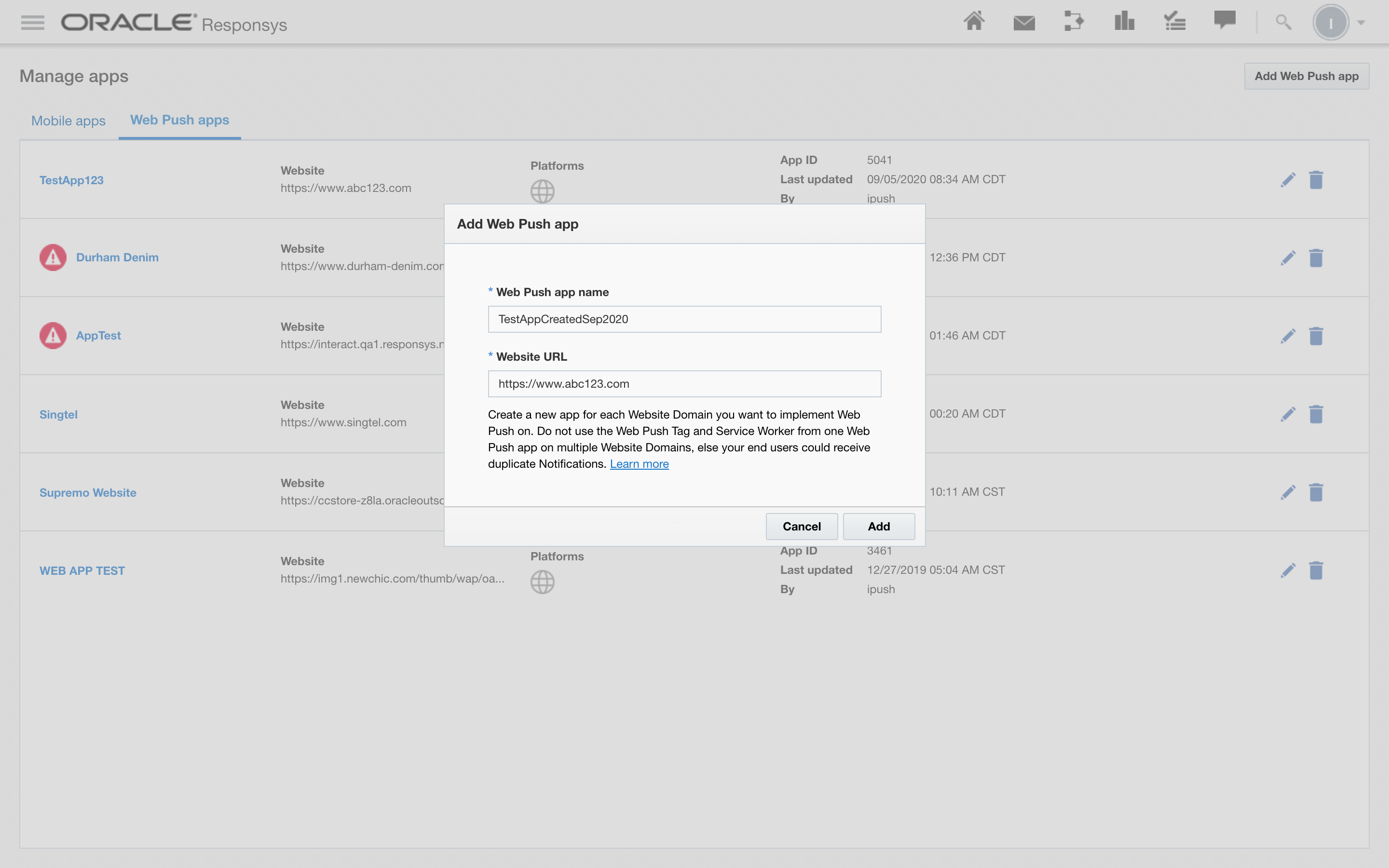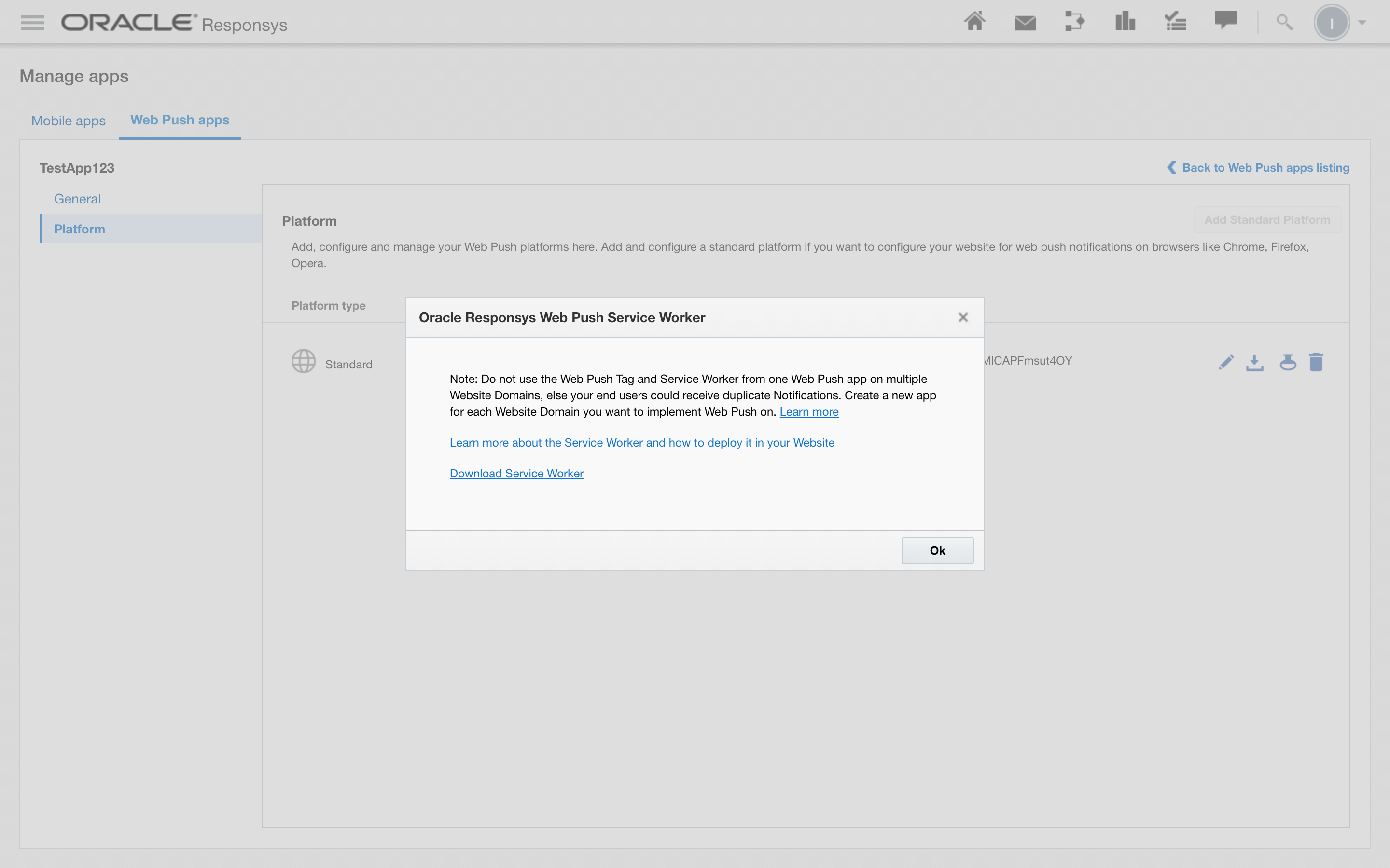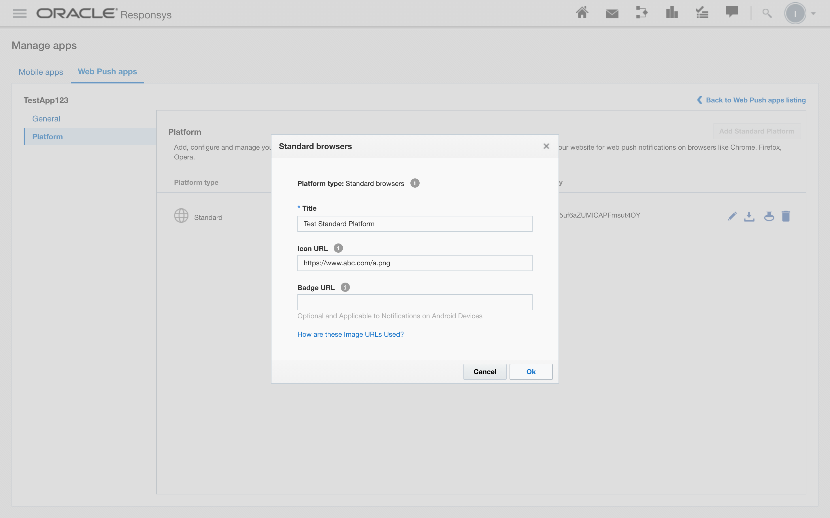 The Badge URL is now an optional attribute for standard platform setup. You can now add a new Web Push app or edit an existing Web Push app without specifying the Badge URL attribute for the standard platform. To use the Badge Image for Web Push on Android devices effectively, you must comply with Android badge icon guidelines.