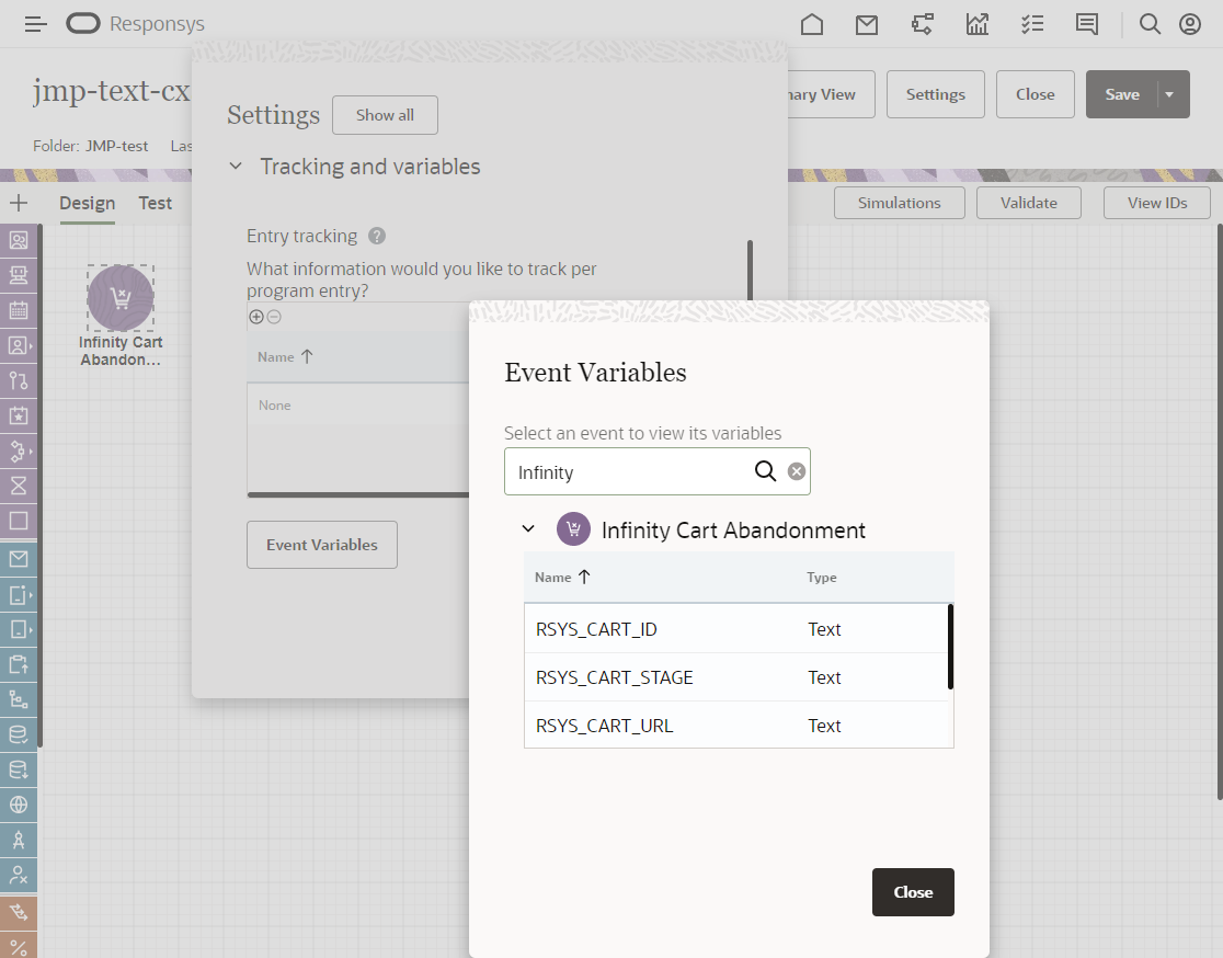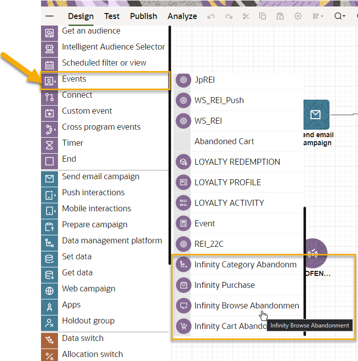 You will be able to add these events to a program orchestration in Program Designer. When you add any of the above, entry tracking variables for the event are added to your program. You can then route program entries using Infinity Streams-specific entry tracking variables in Data switches.