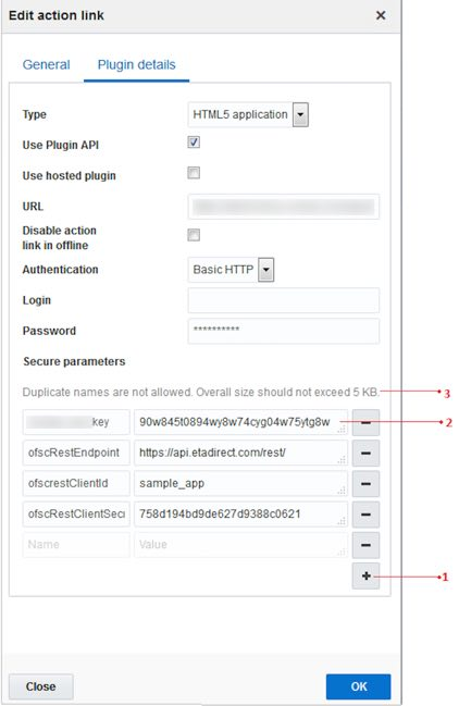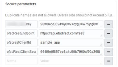 The "Secure parameters" section includes a Parameter name and a Parameter value. Once configured, this data is encrypted and stored in the database. A maximum of 20 key-value textbox pairs of values can be added, after which the button to add the parameters is hidden. The maximum size of the parameters allowed is 5 KB. This size includes the data structure overhead and doesn't correspond to the length of keys and values of strings. Changes to the secure data are sent to Mobility during the next synchronization. The data is sent to the plug-in when the next message is sent.