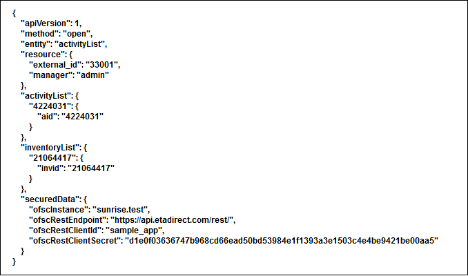 The message contains 'securedData' only if at least one key-value pair is configured for whatever plug-in on Action Management > Add/Edit action link screen in Manage.
