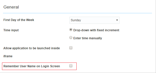 - Click Save. The next time you try logging into the application, you will see the Remember my username check box displayed on the Login screen.