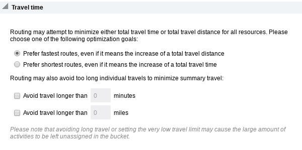Regardless of the optimization goal that is used, you could also limit the maximum travel time and travel distance for every travel (either to first activity or from last activity or between two activities). The maximum values for the Avoid travel longer than field are 1440 minutes and 900 miles.