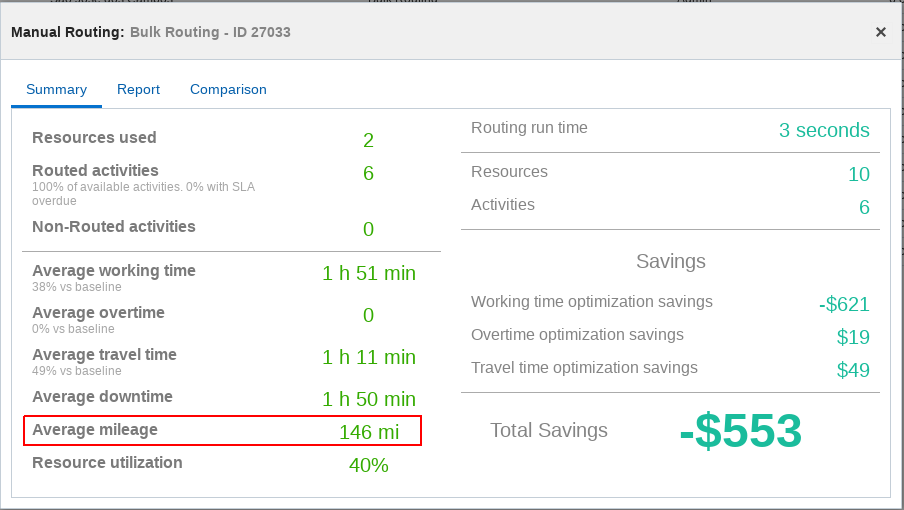 A new line shows the Average Mileage per route for travel-enabled activities (either Average Mileage or Average Kilometer, depending of the units chosen) in the routing summary screen.