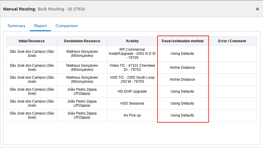 A new line shows the method of distance and/or time estimation for travel to each activity in the routing report. The following methods of travel estimation are available: