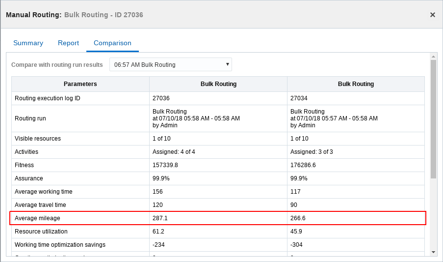 A new line shows the Average Mileage per route for travel-enabled activities (either Average Mileage or Average Kilometer, depending on the units chosen) in the routing comparison screen.