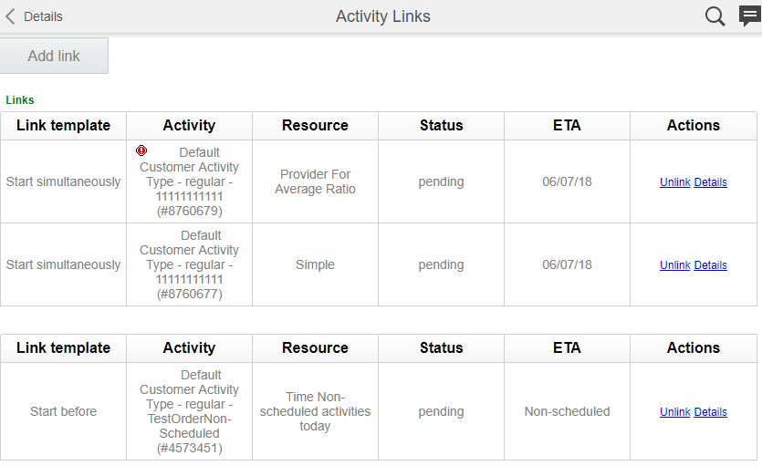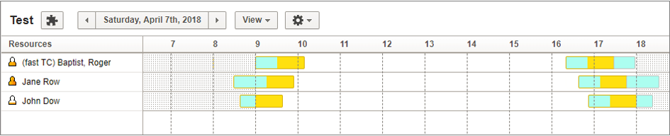 Routing also takes into account the duration of unpaid travel for resource types while routing activities under immediate, urgent, and bulk routing. The following figure shows the Time View with travel durations: