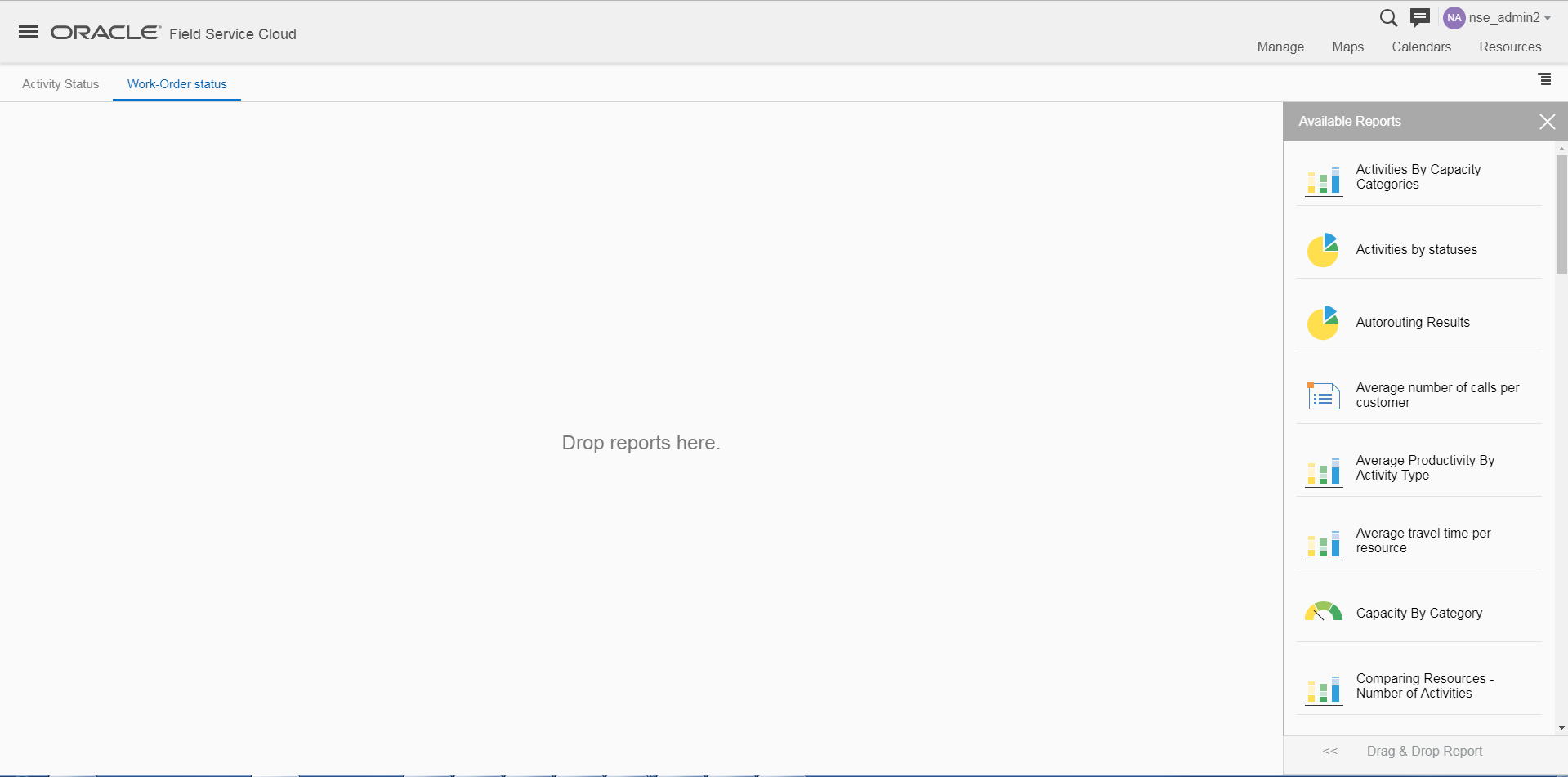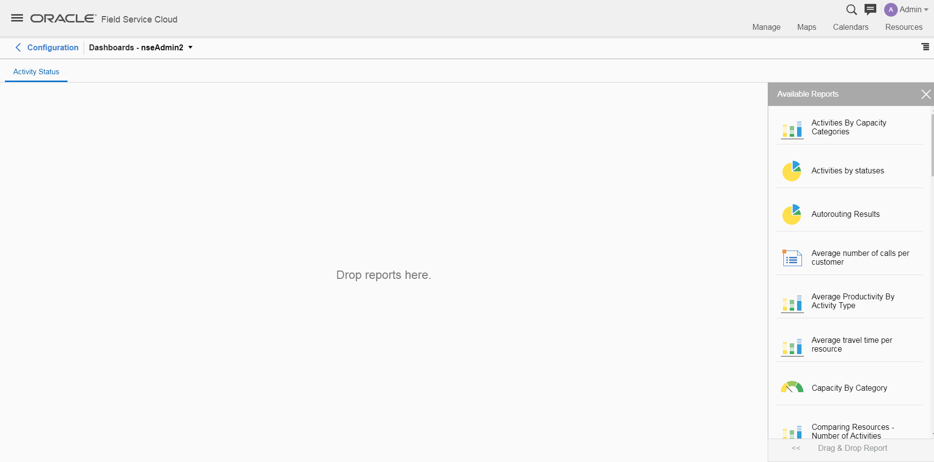 NOTE: Oracle Analytical Cloud Service instance should be active while accessing the embedded reports in Oracle Field Service Cloud. If not active, a blank page will be displayed with error details.