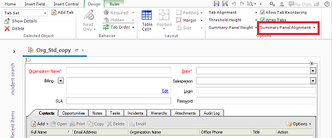 The choices are First Tab and Top. The default option is First Tab and the above workspace in Agent Browser UI would render as the tabset having a summary panel that would include all of the fields located above the tabset in the image above (See image below).