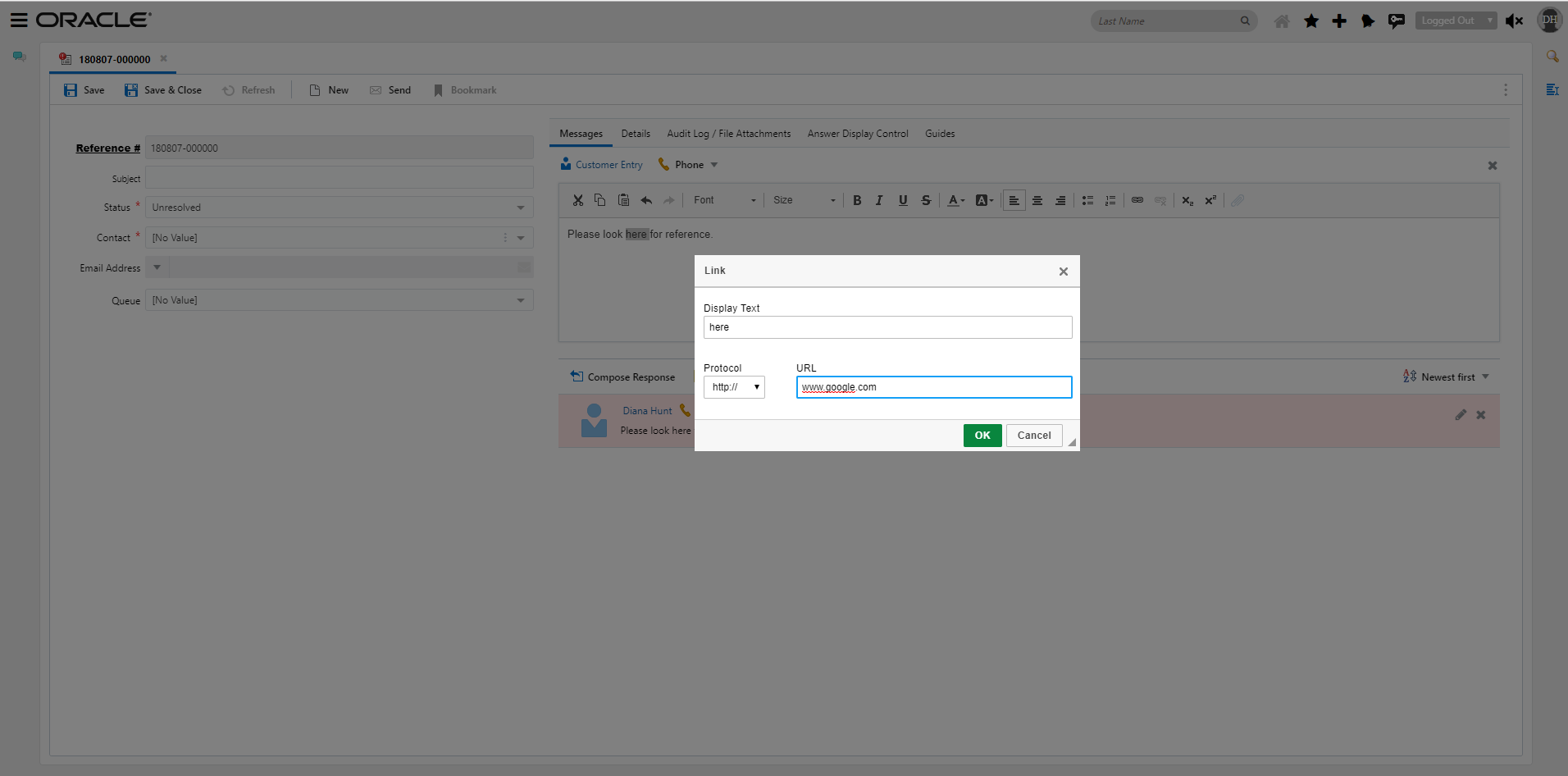 Once the user selects OK; the dialog will close and the link will be added to the text.