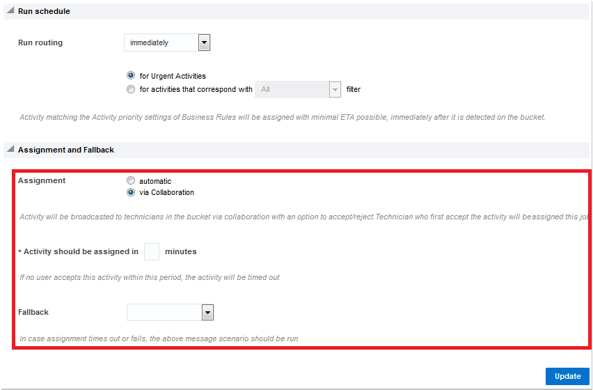 The via Collaboration option will use Collaboration to automatically broadcast the activity to matching resources. Once broadcast, those resources will receive a collaboration alert where they can accept or reject the activity. The activity will be assigned to the resource who accepts the activity first.