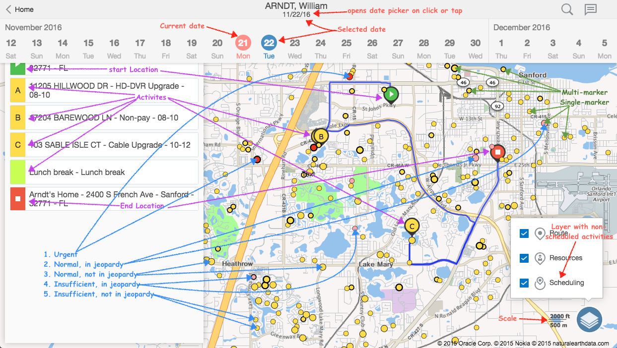- Multiple days of activities to be assigned and constantly (re)optimized in a single routing plan