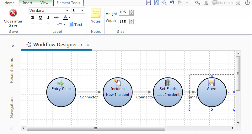 The Agent Browser User Interface now includes support for the Save workflow element. The Save element is used to save all records that are open in the workflow record pool. To close the records after saving, click to highlight the Close After Save button on the ribbon.