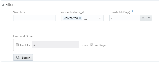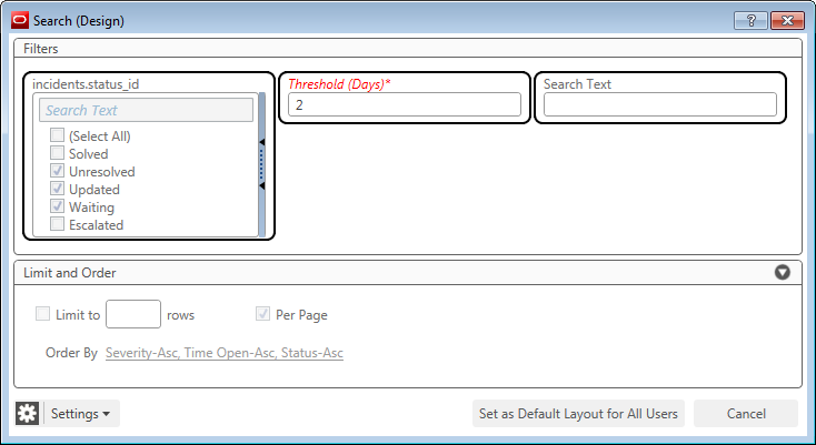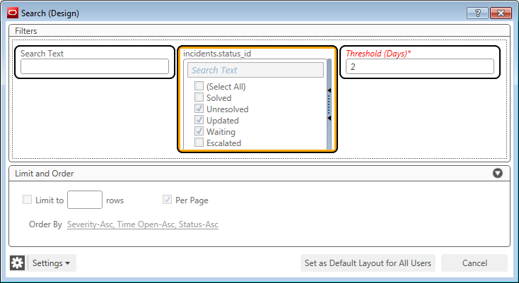 If the Search Designer is used to move the Search Text filter in Front of the Status filter as shown below then the Search Text filter will be the initial filter in the Agent Browser User Interface filter area for the report.