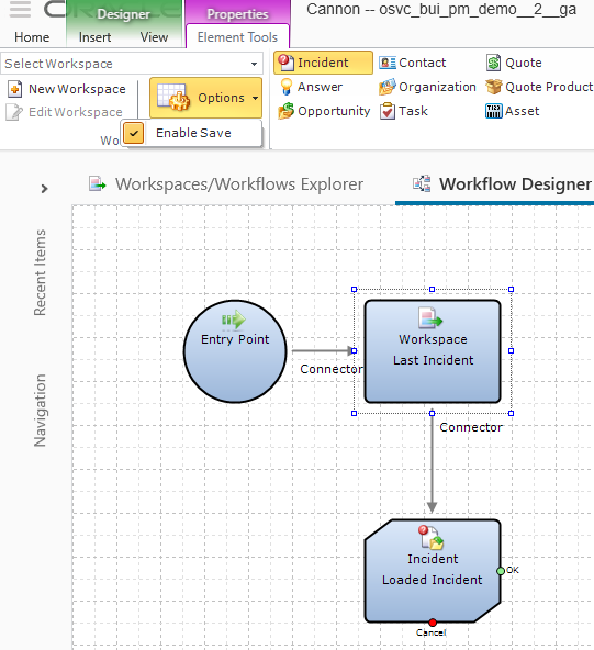 In the Workflow Designer, there is an Options menu in the ribbon for the in-focus workspace. This menu contains one option: Enable Save.
