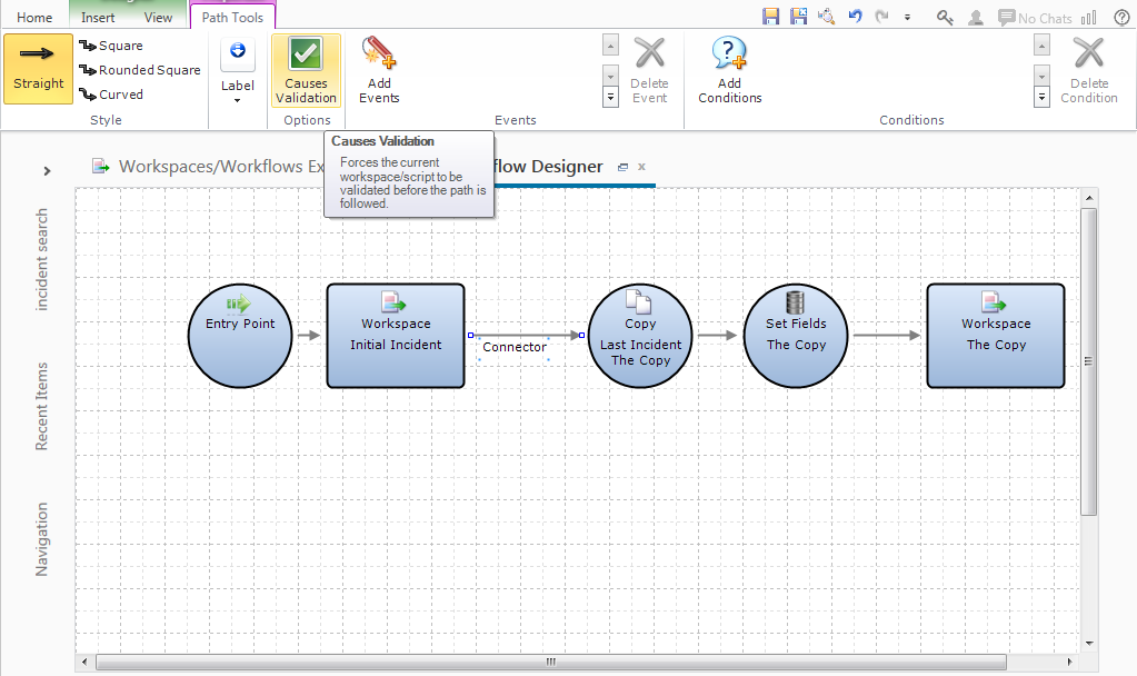 In the image below, the Causes Validation configuration option will ensure that the values of the current incident record are valid according to the Incident Workspace that is associated with the Workspace Initial Incident Element on the Workflow.