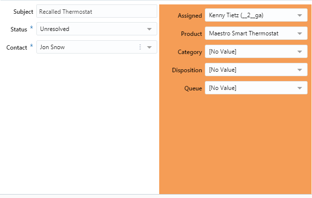 The following figure shows a panel control on the right. The panel has been defined to span three rows. The single panel contains the Assigned, Product, Category, Disposition, and Queue fields.