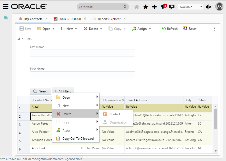 You can select multiple records in a report and delete them simultaneously. There are a couple of ways that the delete process can be initiated. The first is to use the Delete action located in the report toolbar. The second is to use the right click contextual menu which is shown in the image below.