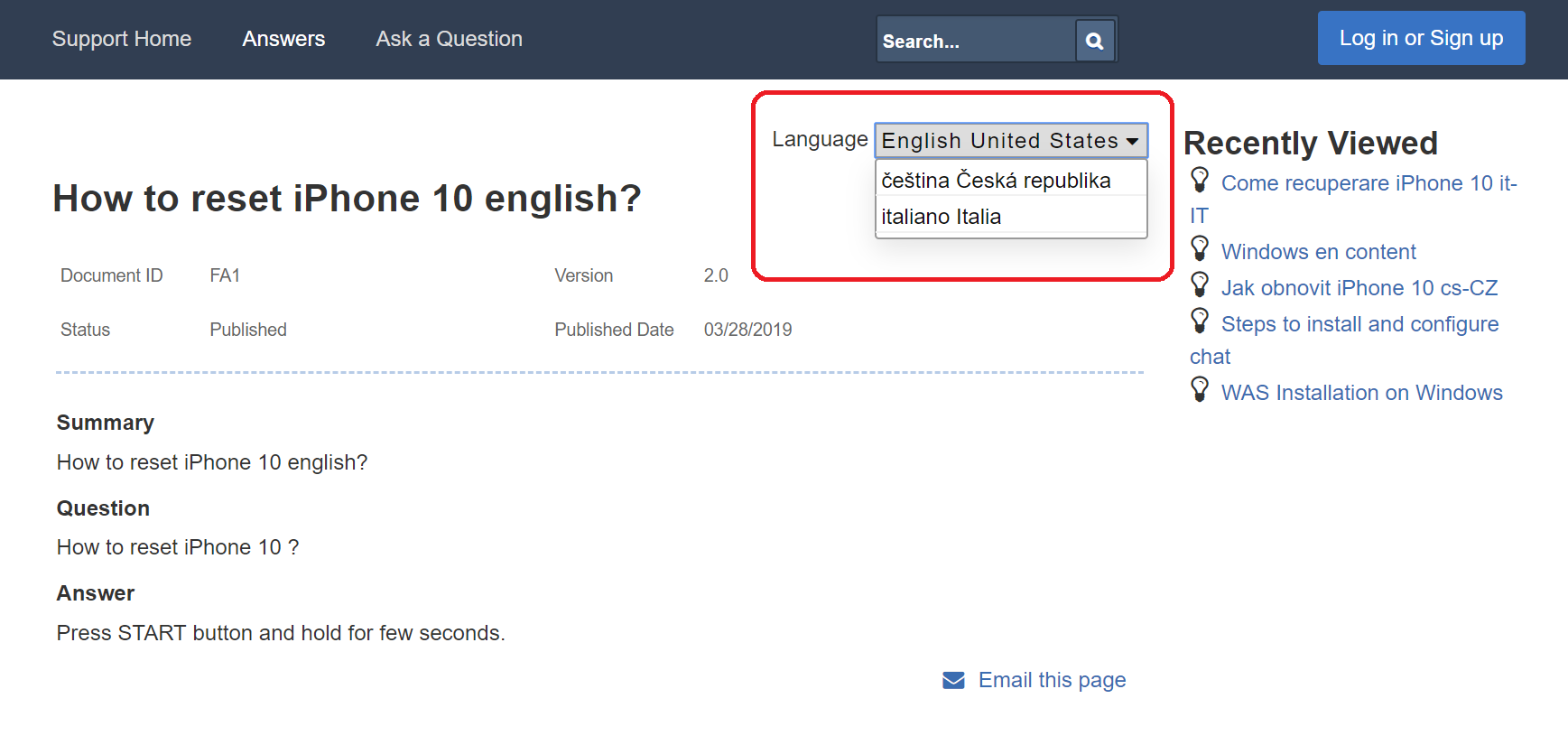Users on Customer Portal will benefit from the feature as it will allow them to switch to translated locale of answer right from answer detail page. Previously, they could access translated locale (non-interface locale) answer only via search results.