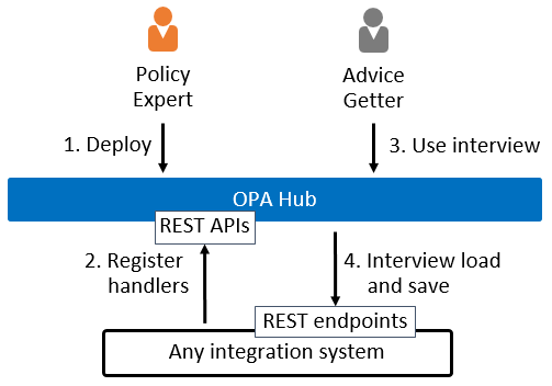 The OPA generic integration protocol is a web service based integration protocol that allows different endpoints to be configured for each Load or Save operation needed by a deployed OPA interview. It uses the same OPA Hub REST APIs as used by the new Oracle Integration OPA interview adapter. The generic integration protocol: