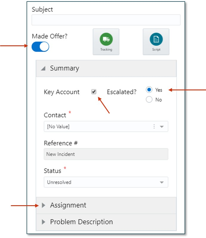Yes/No Fields Can Be Displayed As a Switch, Radio Button, or Checkbox in Agent Browser UI. Tabsets can be displayed as an accordion.
