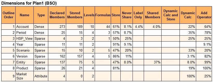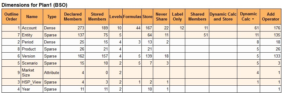 The Activity Report tables depicting outline dimension order and statistics of each cube in the application have been enhanced to include the total number of dimension members based on various settings such as data storage type (store, never share, label only, shared members, dynamic calc and store, and dynamic calc) and the operators in use. Previously, this information was presented as percentages.