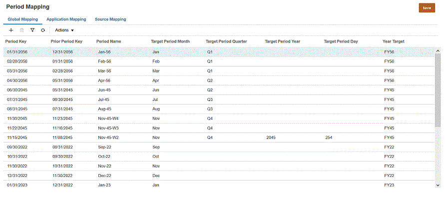 The Period Mapping option is available on the Actions drop-down on the Data Integration home page for administrators only. On the Period Mapping page, customers can create and manage period mappings including: