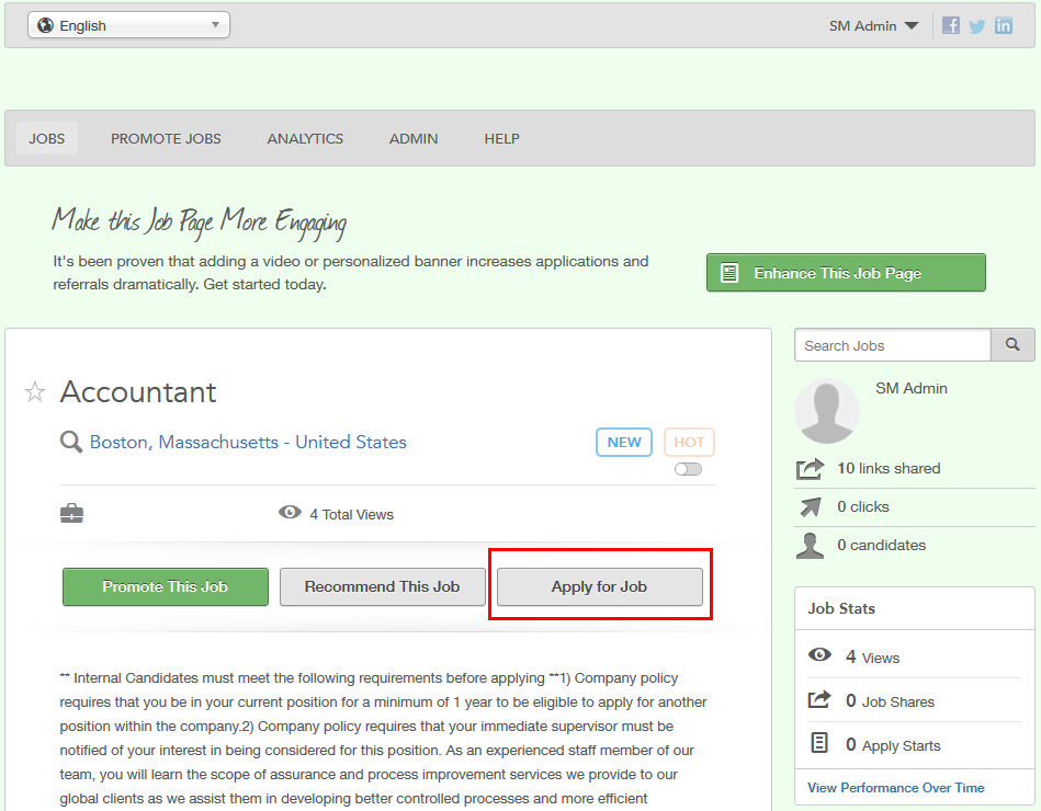 Sourcing no longer displays the Apply for Job button to employees for jobs posted to external only Career Sections synchronized to the site. This ensures that employees cannot apply to external only postings, but are still able to promote those external jobs to their network. Up through 15B.7, jobs posted to external only Career Sections were displayed to employees and available for employees to refer, promote and apply. With 15B.8, the ability for employees to apply to these jobs has been revoked while maintaining the ability to promote these jobs.