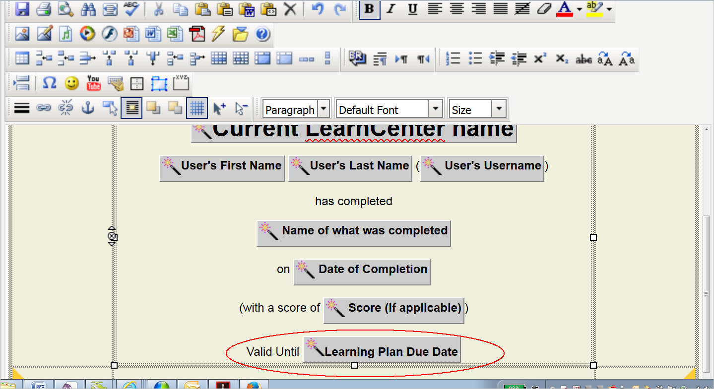 With the addition of Recurring Learning Plans, you may want to create Certificates that reflect expiration dates for the Learning Plans for which the certificates were earned. For example, you might want to add “This Certificate is Valid until February 28, 2017.” To do this, add the dynamic tag for the Learning Plan Due Date.