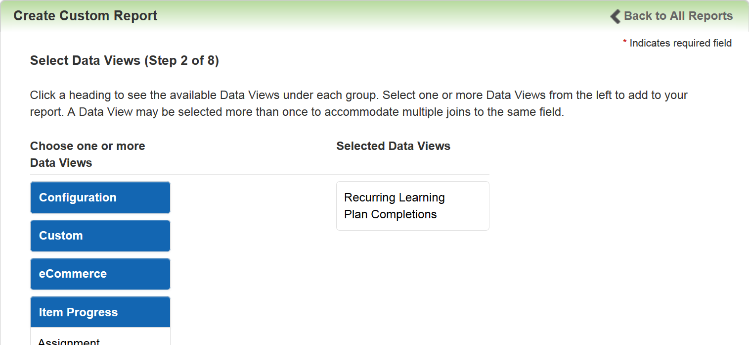 When you select this Data View, Recurring Learning Plan Completion fields become available in Step 5 of the Custom Report Wizard.