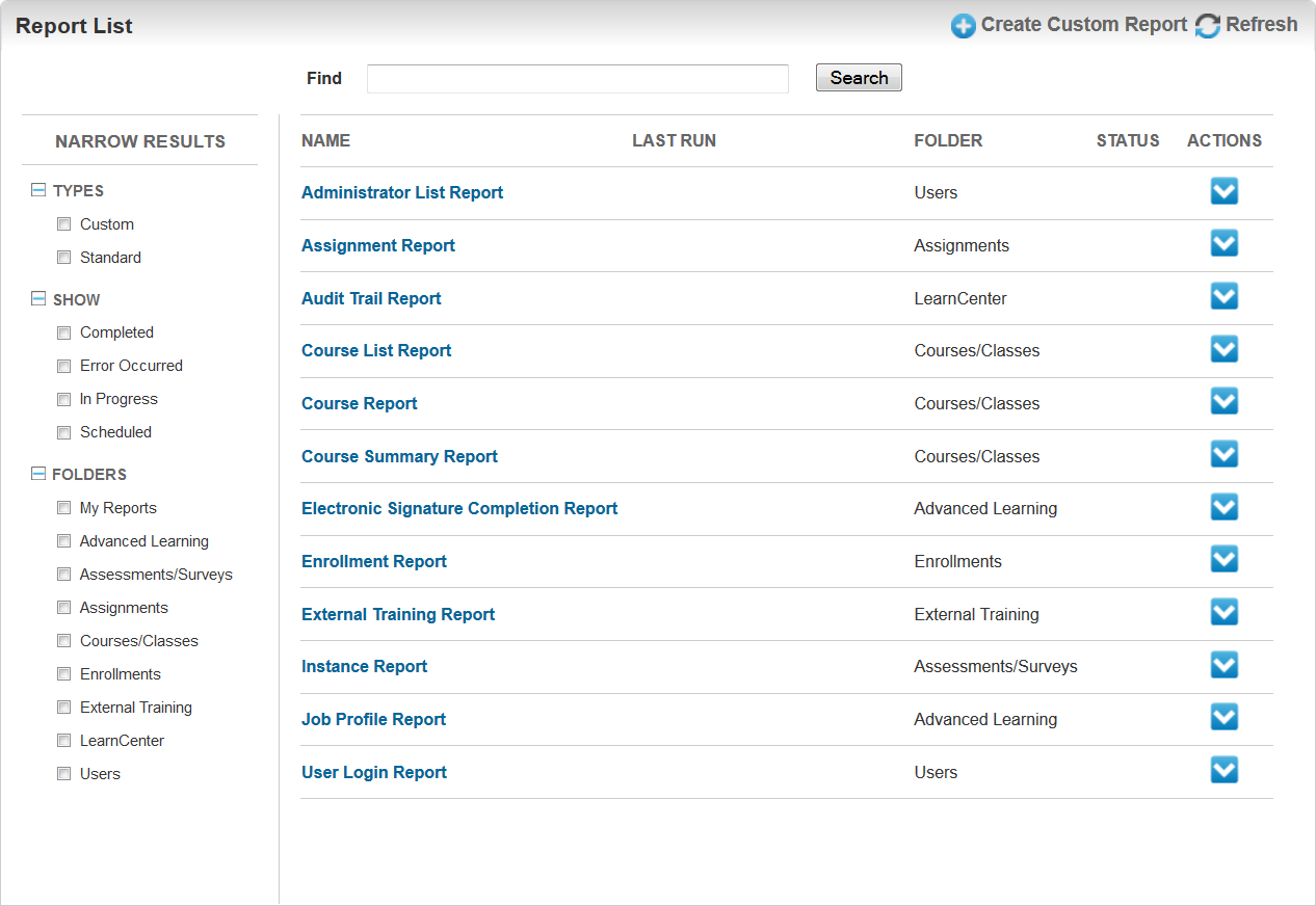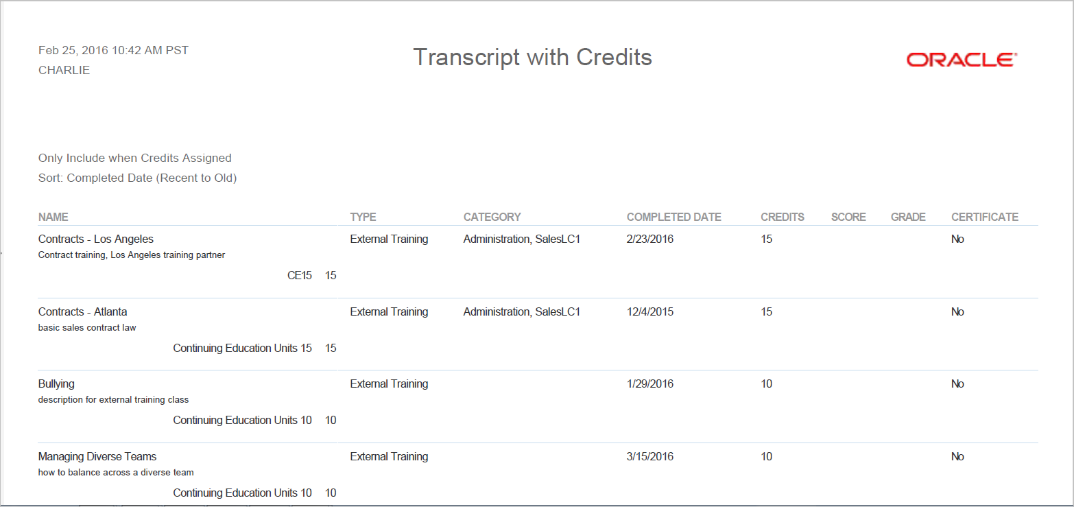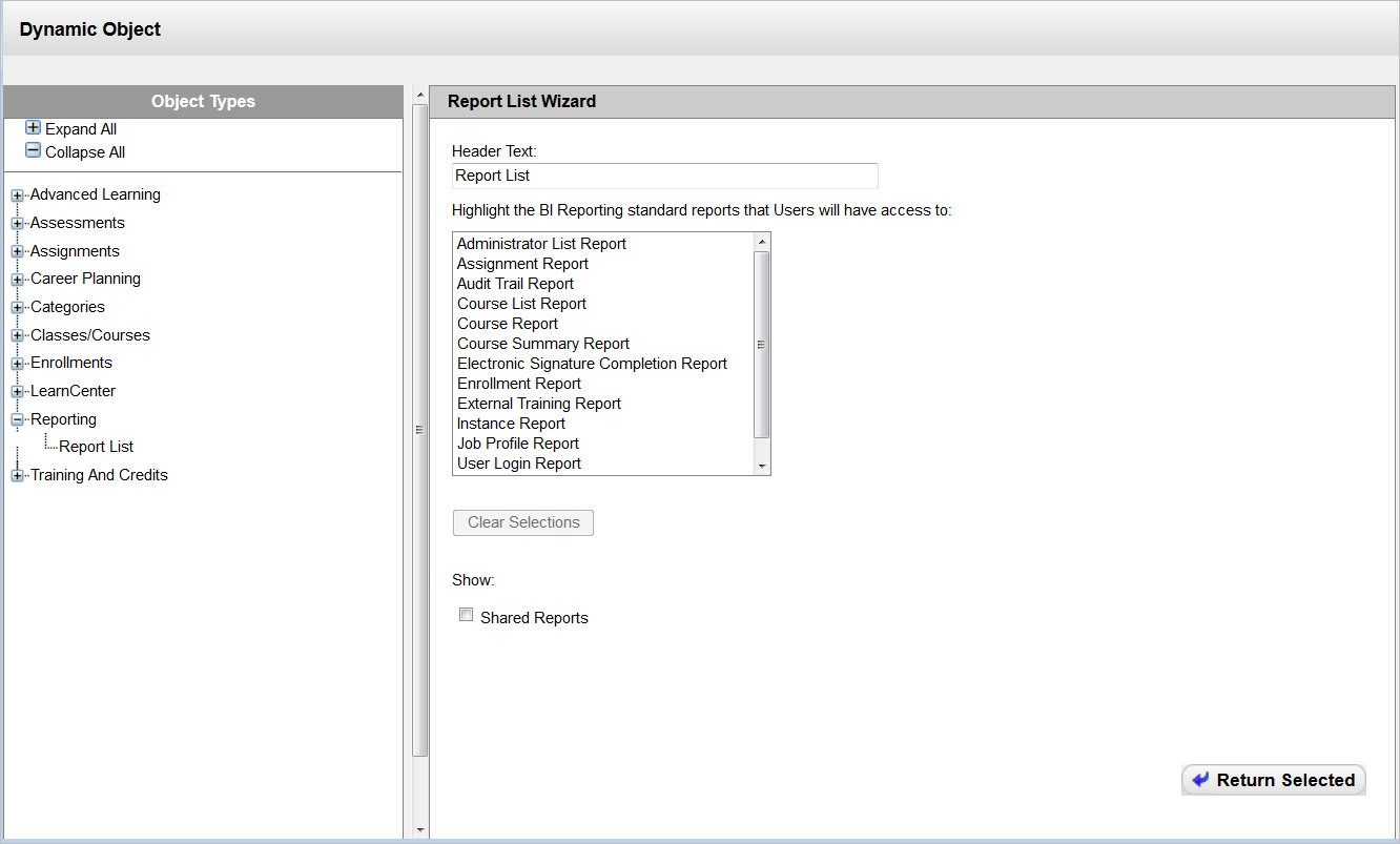 There are new BI Reporting enhancements included with Oracle Learn Cloud Release 16A. These enhancements provide additional capabilities for Administrators and the ability for end Users to run their own reports via a dynamic object.