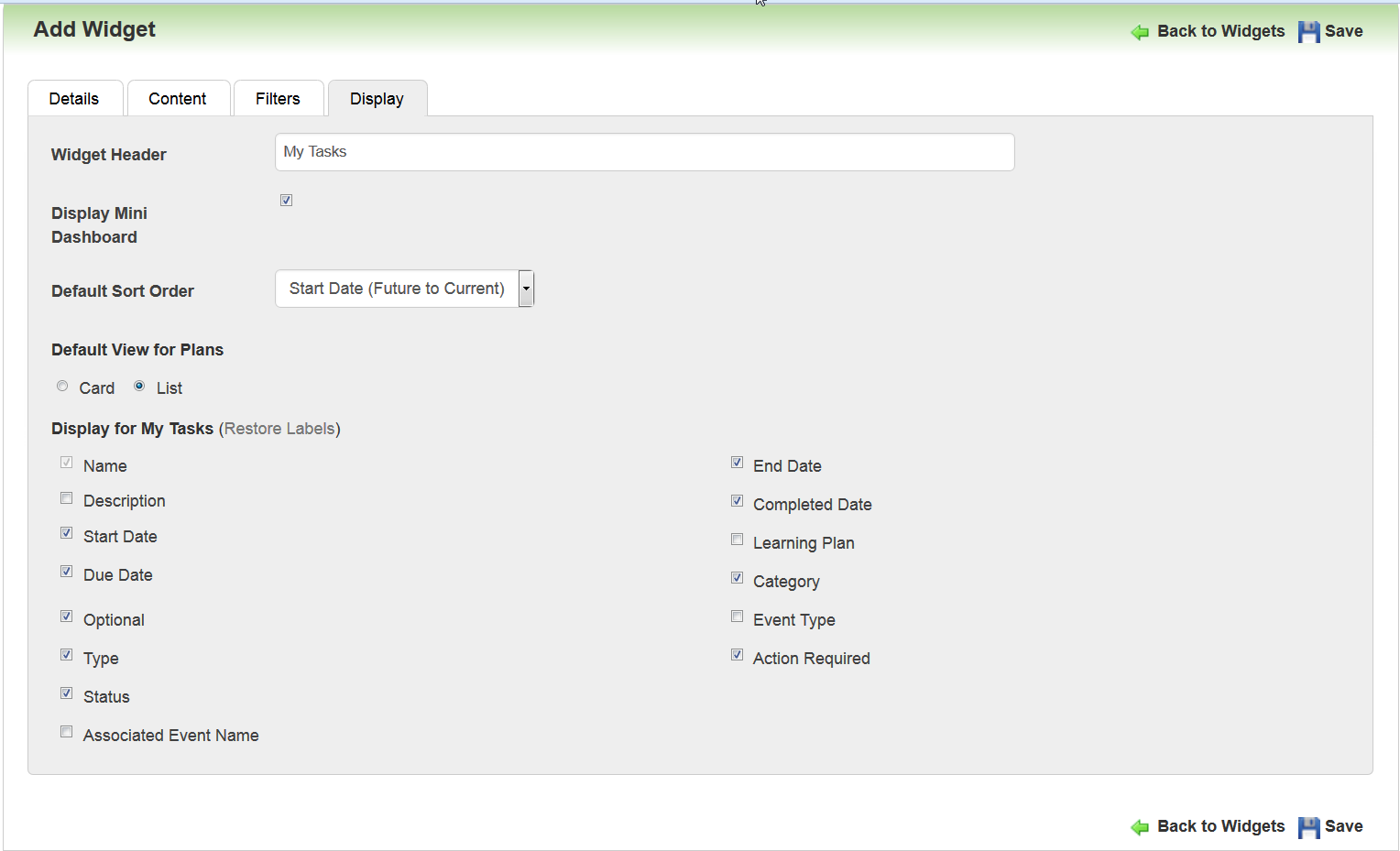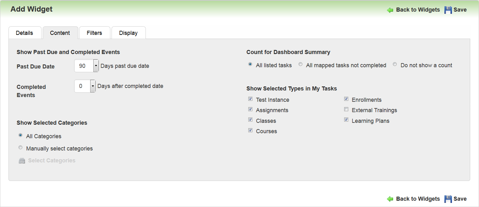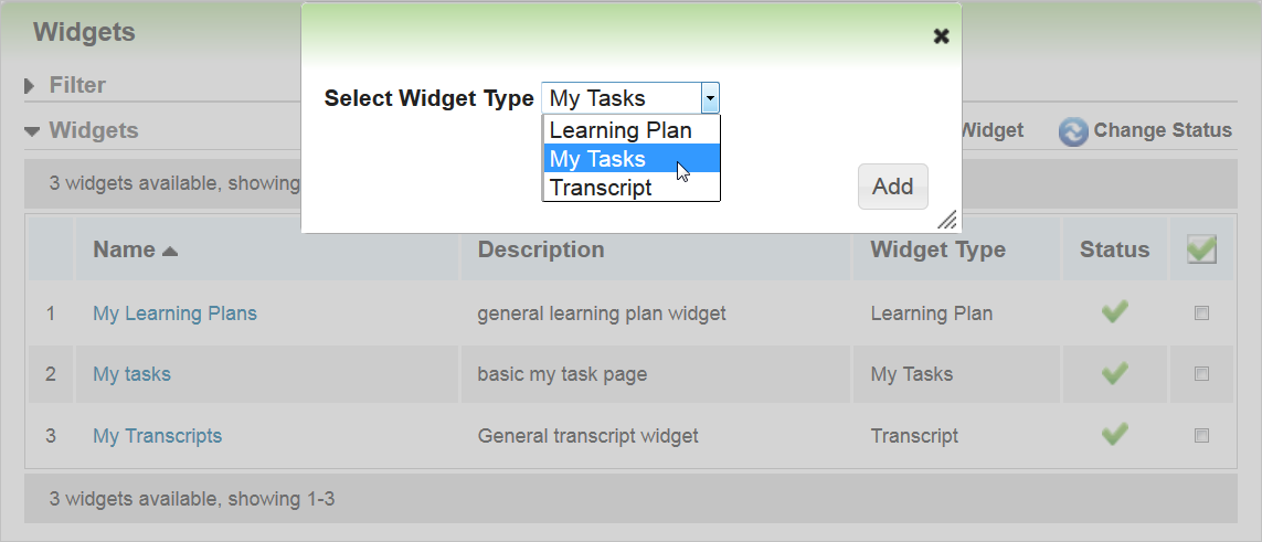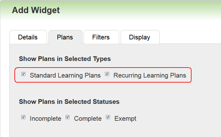 There is a new Show Plans in Selected Types field on the Add Widget Plans tab. This field enables you to indicate what type of Learning Plans you want to display on the Widget (Standard or Recurring).