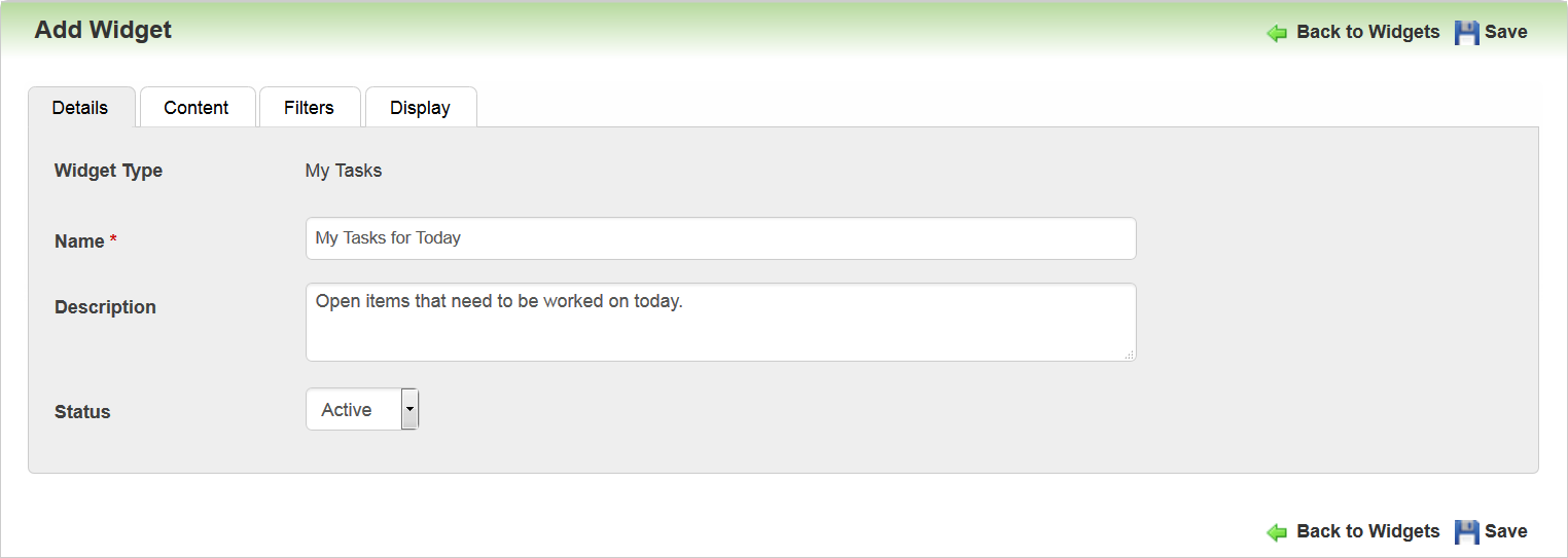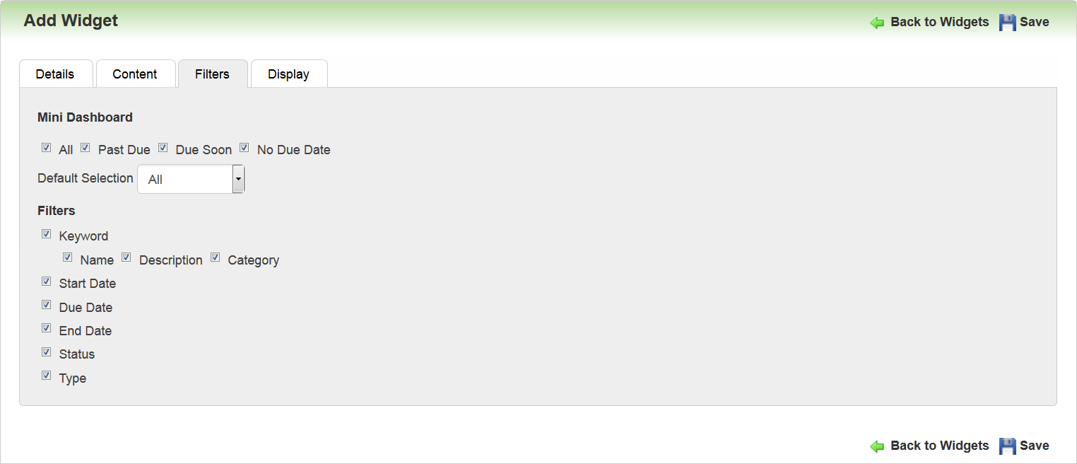 The My Task Widget displays according to the options selected by the Admin in the setup discussed in the previous sections. The illustrations below depict some of those settings.