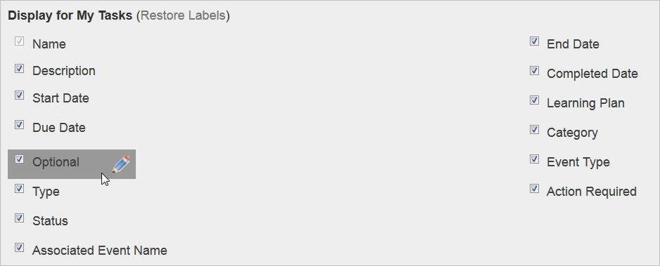For most items in Display for My Tasks, you can customize the field label (a pencil icon displays when you mouse over the item, indicating that it is editable). Click the icon to open an editable field and type the text you want to display for the field. You can restore labels to their default settings by clicking Restore Labels.