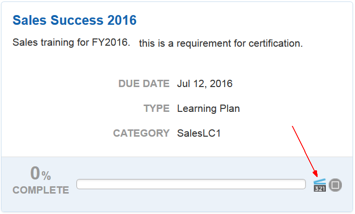 - Learning Plan - if a learning event on the My Task page was mapped from a Learning Plan, the Widget displays the Learning Plan name. The label is LEARNING PLAN followed by the Learning Plan name. Note that if the same Event is mapped from multiple Learning Plans, the Widget displays them all.