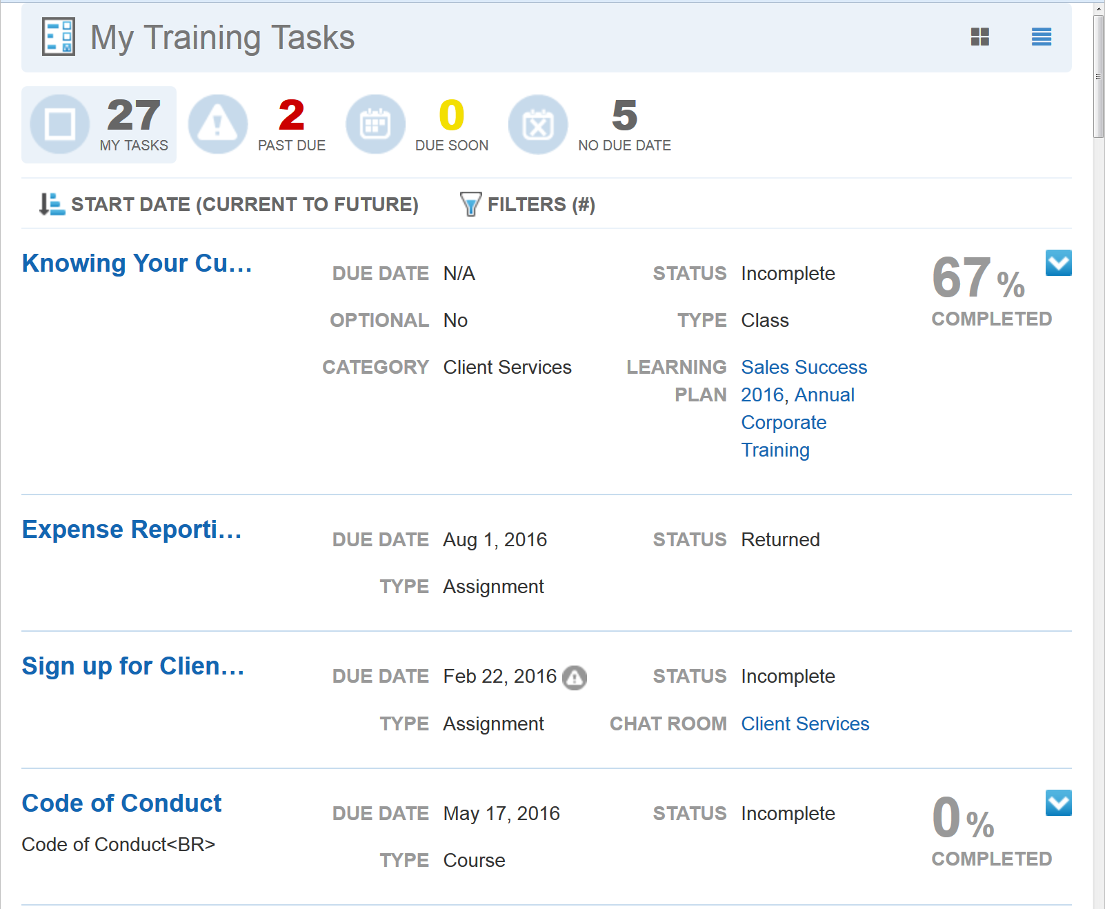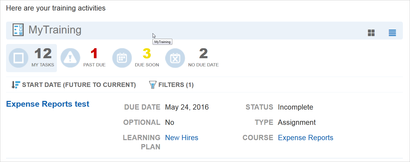 Tasks that are associated with other items are indicated like the following illustration in which the task is associated with a Course (Expense Reports test). The Source of the Assignment is a Learning Plan (New Hires).