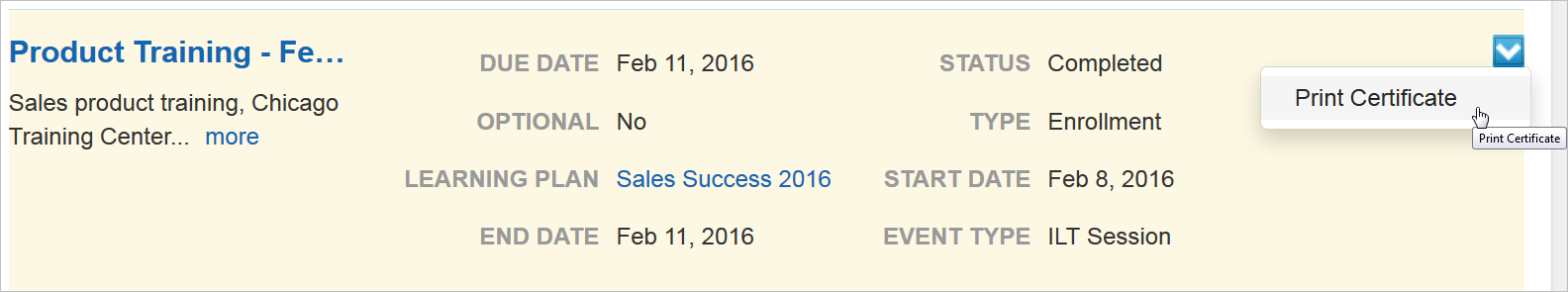 A Print Certificate option is available from the action icon for completed Enrollments and Learning Plans that have associated Certificates.