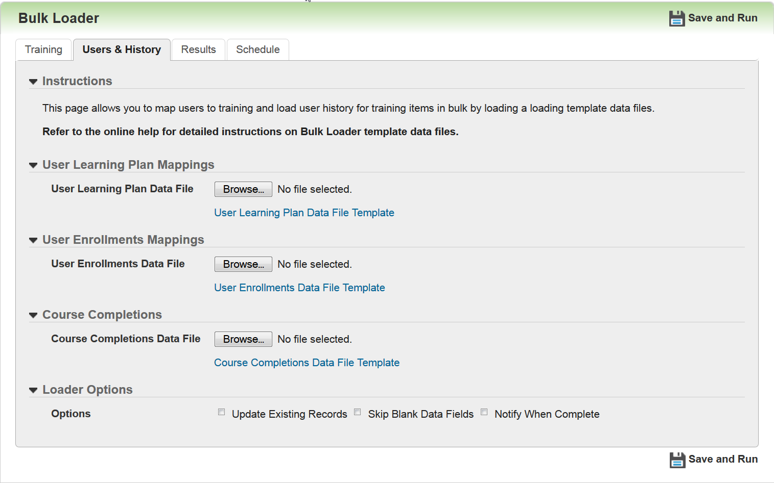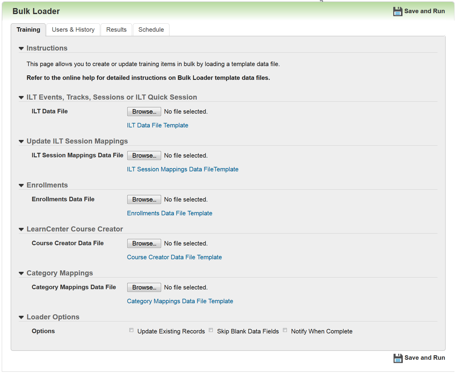 Use the Training tab to bulk-create and update training items and category mappings. Loaders introduced in previous Learn releases remain unchanged. New items for 16A that have been added to this tab are: