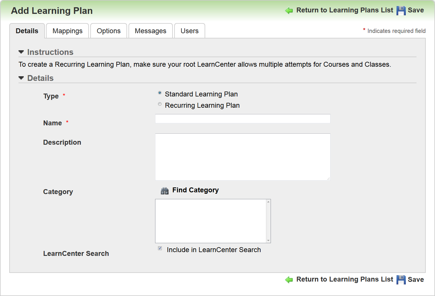 There is a new Type field on the Add Learning Plan Details tab. Use this field to indicate whether you are creating a Standard Learning Plan (non-recurring), or a Recurring Learning Plan.