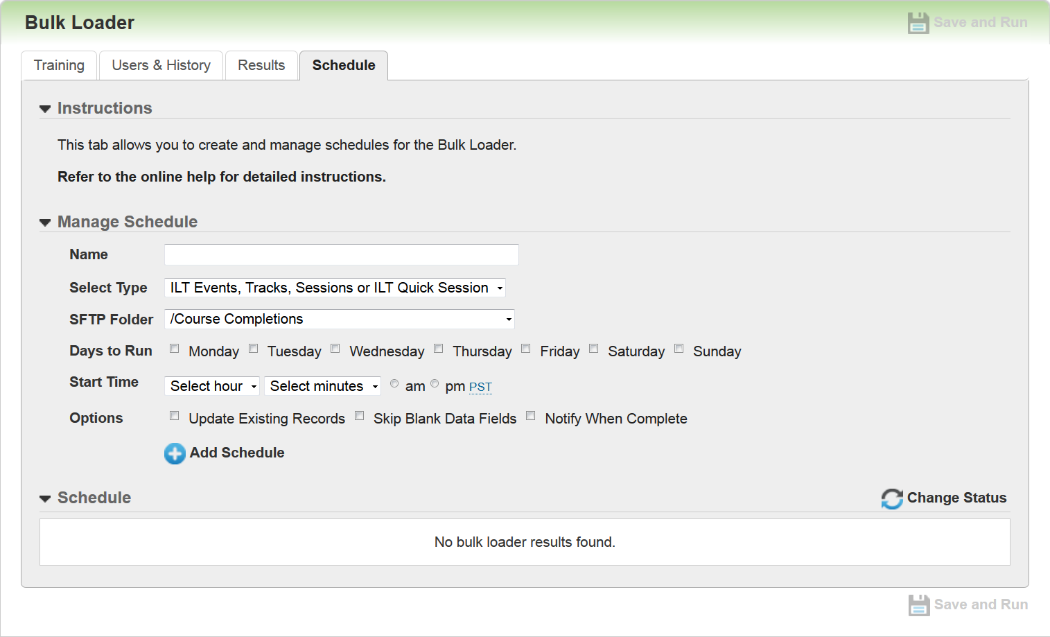 Use the Schedule tab to create scheduled data loads. This feature is particularly useful if you want to load data from third party training sites on a regular basis (for example: you can take data from third party web-based training completions, or third party badge readers from ILT sessions and attach that information to Enrollments). Once scheduled, LearnCenter will pick up a file from your SFTP site to begin processing them during the timeframes you indicate. To create a new schedule, do the following: