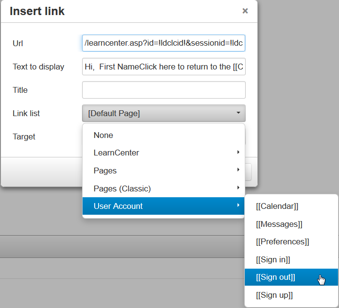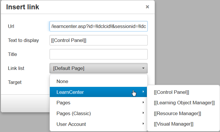 The Insert link window has been enhanced with the ability to insert pre-defined links to various pages in the LearnCenter.