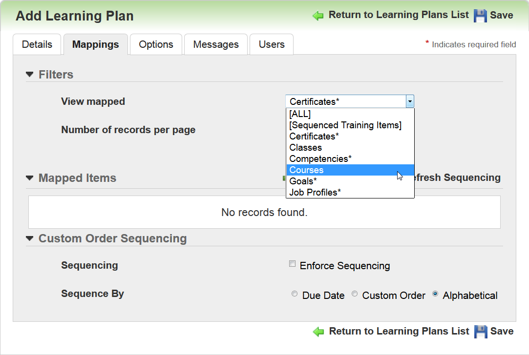 Only Courses and Classes are supported for use with recurring Learning Plans. Map the appropriate Courses and Classes to the Learning Plan, and then click the Options tab.