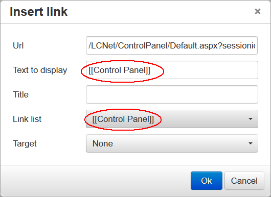 When you select a page, other fields on the Insert link window are populated with the appropriate data. For example, the Url field is populated with the necessary data to make the link to the appropriate page. The Text to display field contains a sample field label that will display to end Users. You can change this text if you want to. Items that are presented in the Link List surrounded by brackets, [[ ]], can be localized. If you do not want the items to be localized, remove the brackets.