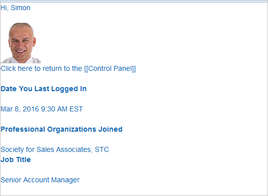 The following is a sample preview page with some of the elements discussed in this section. Notice the use of standard fields (First Name, Job Title, and Date Last Login), image (User Photo), and a custom field (Professional Organization).
