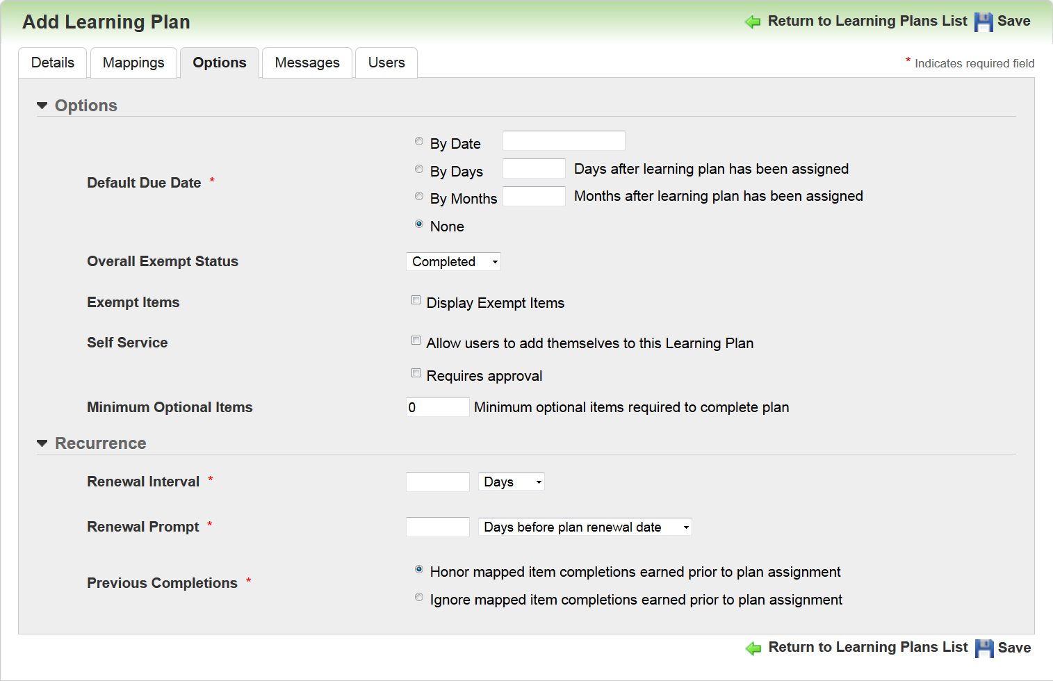 Use the Previous Completions field to indicate whether you want to Honor mapped item completions earned prior to plan assignment. This means Users would not have to retake any Learning Plan mapped training that they have previously completed. You could alternatively indicate that you want to Ignore mapped item completions earned prior to plan assignment. This means Users would have to retake any Learning Plan mapped training they have previously completed in order to satisfy the requirements of the Learning Plan renewal.