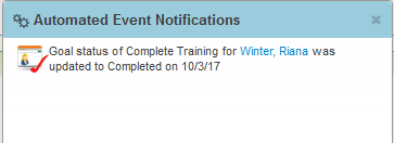 In the above example, the employee’s manager and review manager will receive an email a few minutes after the status of the goal has been changed to Completed, as well as see a small notification in the upper right-hand corner new auto events icon.
